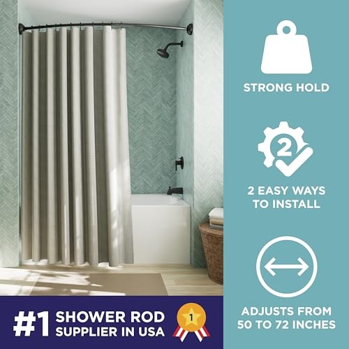 50-72 inch adjustable curved tension rod with no-drill installation. Rustproof for lasting use; curved shape expands shower area. Sturdy tension holds curtain securely. Perfect for standard bathrooms – easy, tool-free way to gain space and style.